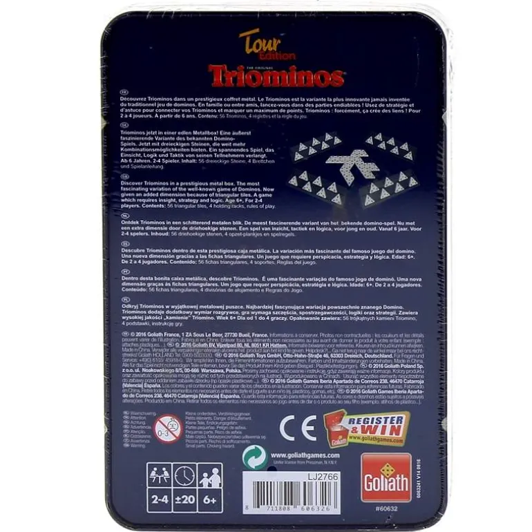 Triominos Tour Edition es la edición Triominos para los más trotamundos. Esta edición dispone de caja metálica siendo más resistente para cuando te la lleves a cualquier sitio con 4 portafichas y 52 fichas de triominos.