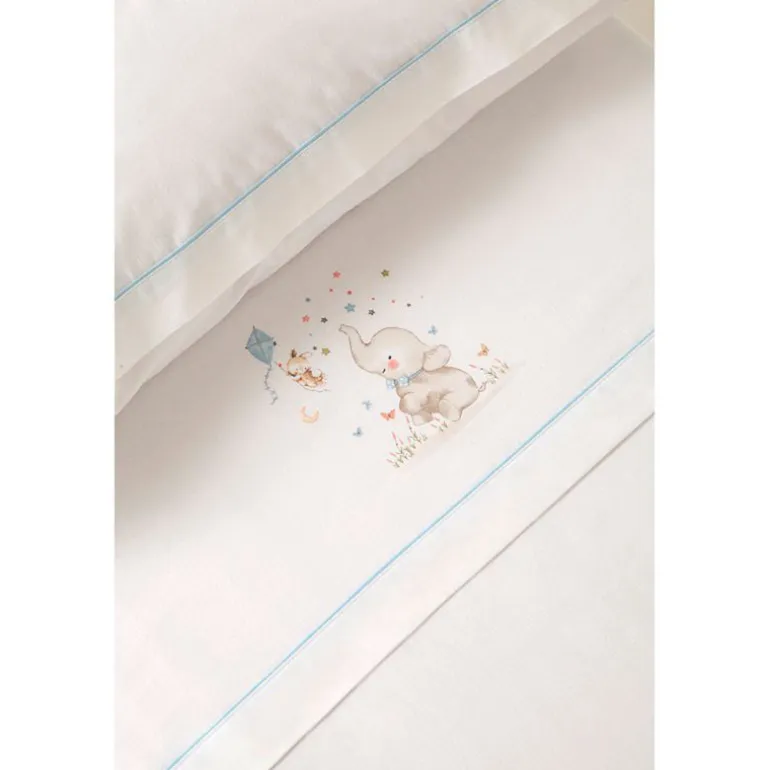Tríptico de sábanas en algodón, con la bajera en color liso, mientras que la sábana encimera muestra el estampado de un divertido dibujo