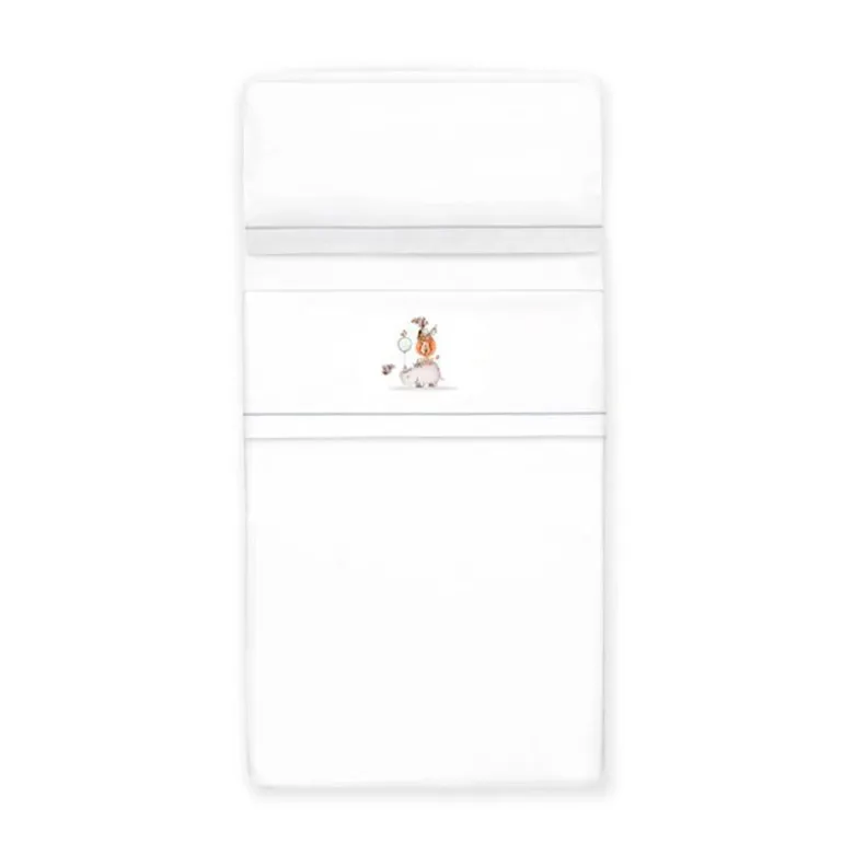 Tríptico de sábanas en algodón, con la bajera en color liso, mientras que la sábana encimera muestra el estampado de un divertido dibujo
