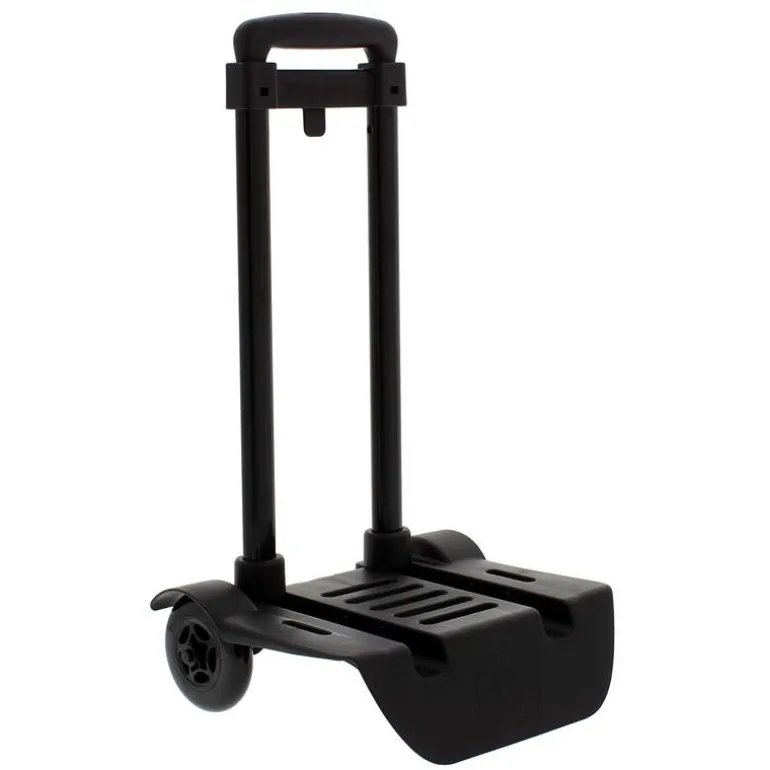 Trolley plegable, en color negro, para adaptar mochilas escolares. Cuenta con una estructura de aluminio resistente, arandelas de fijación en la base, base de PVC con refuerzo y doble eje con capa antioxido. Dispone, además, de un sistema de fácil plegado y de unas ruedas con protección que ofrecen mayor resistencia al rodaje. Es ideal para colocar tu mochila y no tener que cargar con el peso de los libros a la espalda. NO incluye mochila.