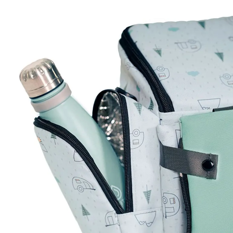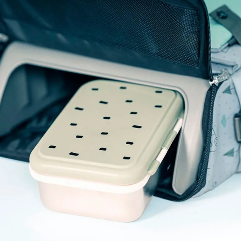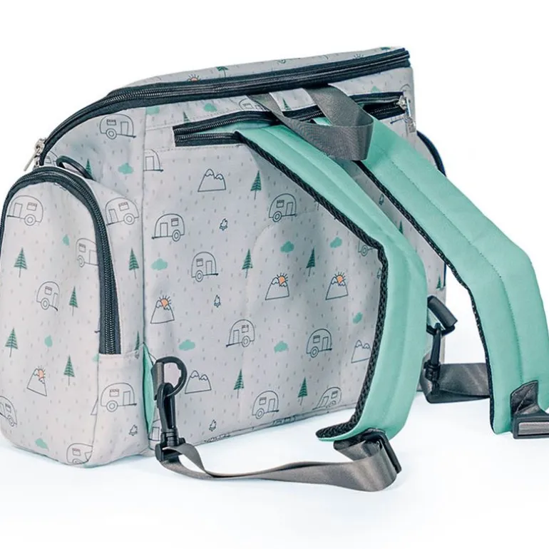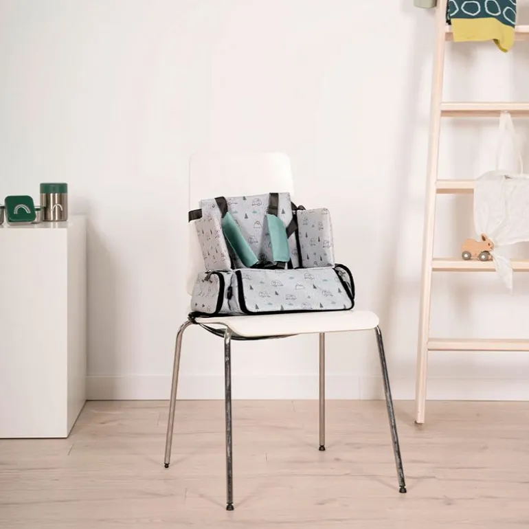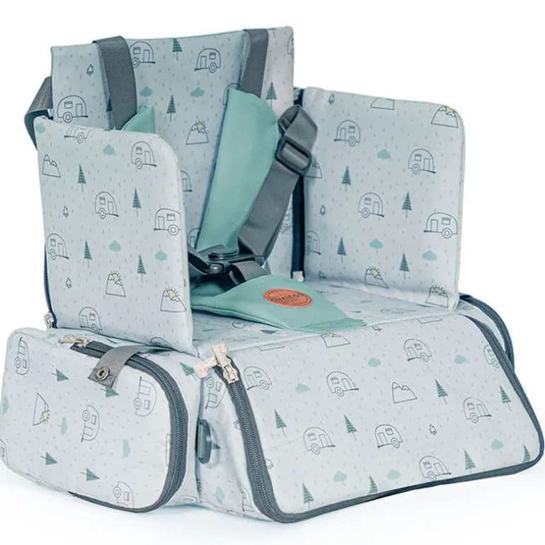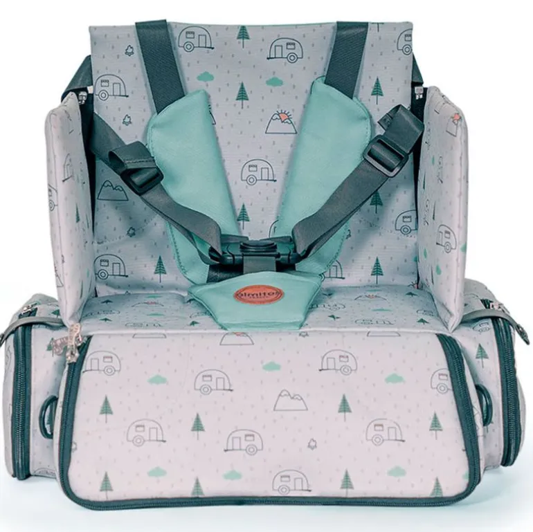 Trona elevador con estructura interior rígida que hace la función de trona portátil y bolso. Es la trona perfecta para ir a todas partes ya que se puede llevar como mochila o bandolera.