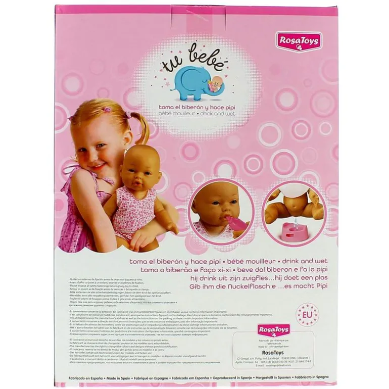 Nuevo muñeco bebé de 35 Cm. Vestido solo con un babero y un pañal básico, toma el biberón y hace pipi. Incluye un biberón y un orinal. Funciona sin pilas.
