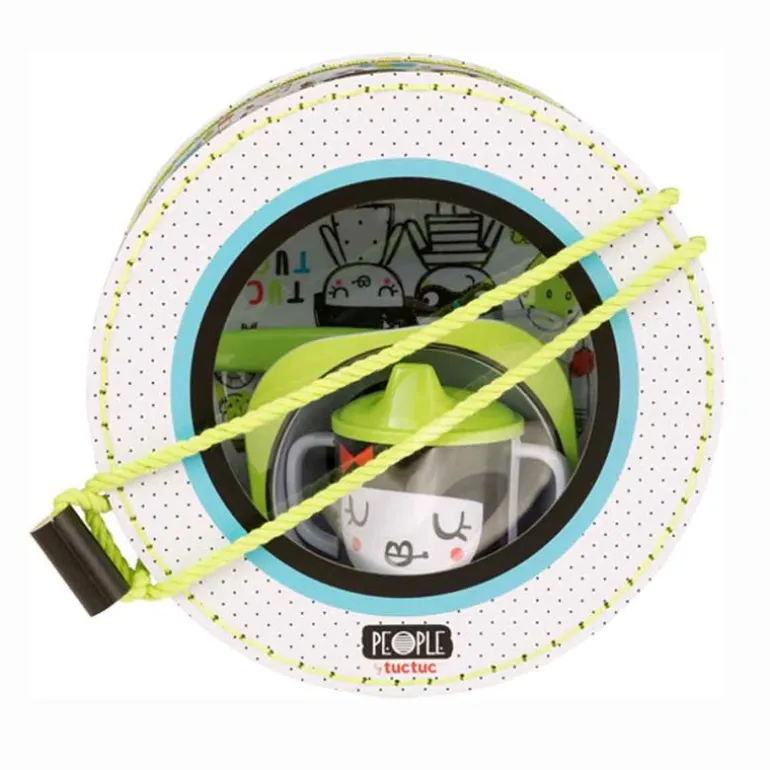 Juego de vajilla de 5 piezas, compuesto por plato y tazón con detalles de la colección, cuchara blandita de silicona y taza ergonómica con tetina que estimula su autonomía.