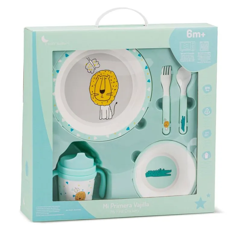 Vajilla formada por 5 piezas para iniciar a tú bebé en la transición de la comida sólida. Este set se compone por un plato llano, un bol, un juego de cuchara y tenedor con las puntas redondeadas y un vaso de entrenamiento con boca ergonómica antigoteo. Cuando el niño se haga mayor, se puede utilizar sin la tapa.