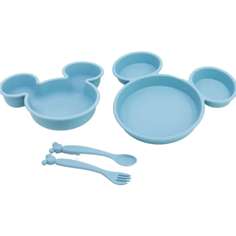 Vajilla para tu bebé que se compone de un plato, cuenco y cubiertos con diseños inspirados en Mickey Mouse.