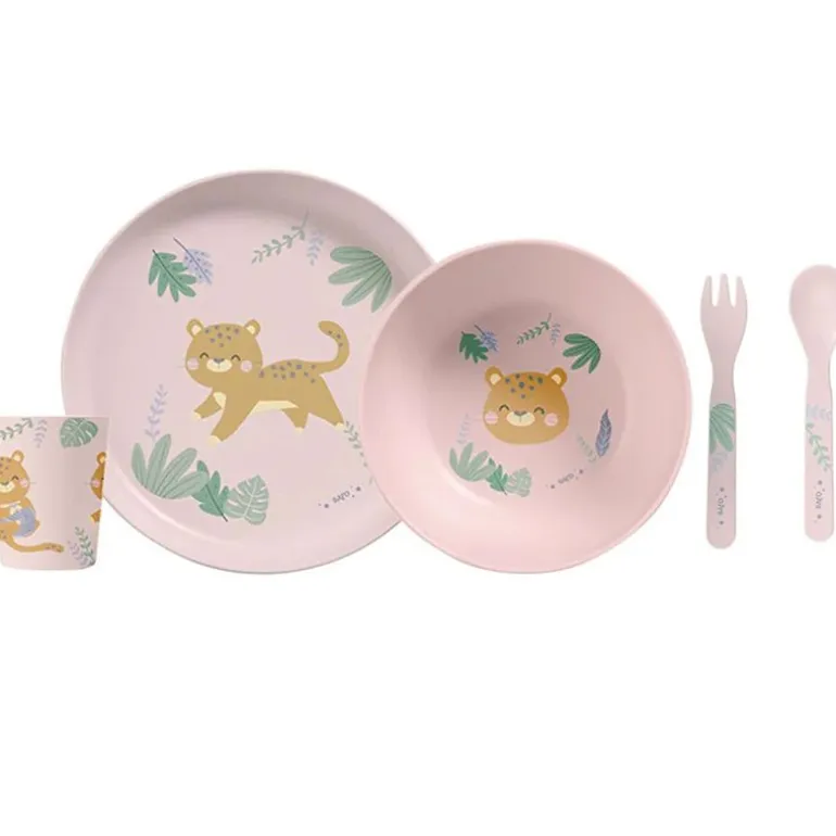 Vajilla infantil de 5 piezas: plato, cuenco, vaso, cuchara y tenedor. Es apta para microondas excepto el vaso y lavavajillas.