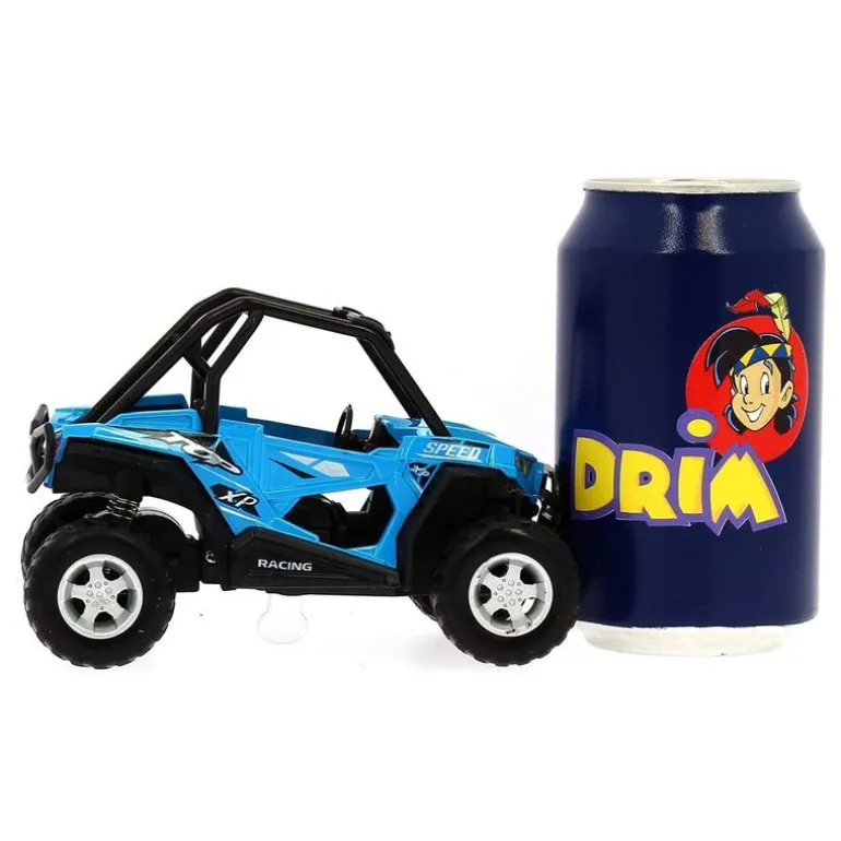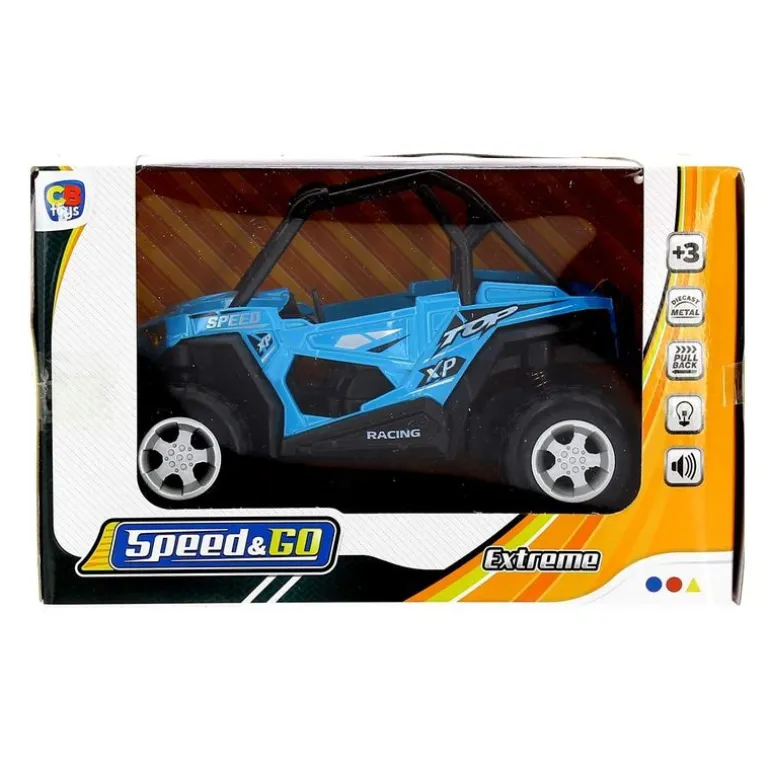 Vehículo Cross Country de color azul. Hecho de metal y con una escala de 1:22. Reproduce sonidos y luces. Funciona con sistema de fricción. Recomendado a partir de 3 años.
