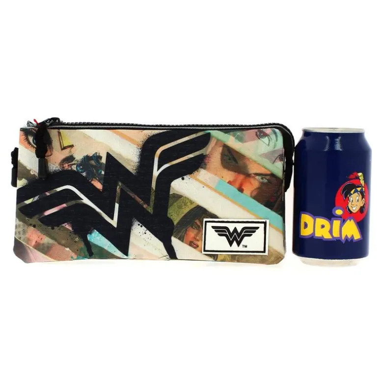 Estuche del tipo portatodo triple, inspirado en el personaje de DC Comics, Wonder Woman. Dispone de 3 compartimentos diferentes para que puedas guardar en su interior tus objetos personales o material escolar. Sus dimensiones son de 23.5 cm x 10 cm x 5 cm aproximadamente. En nuestra web encontrarás la mochila escolar a juego (Ref 37571 – se vende por separado).