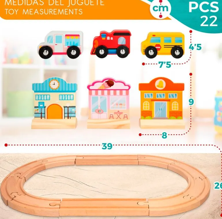 Contiene 10 trozos de pista, un colegio, una estación de tren, una heladería, 3 personajes, un tren, un autobús y un camión de los helados.