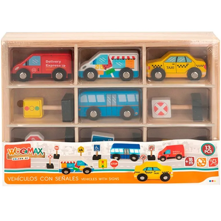 Pack de la colección Woomax en el que encontrarás 4 vehículos de madera y 8 señales de tráfico.