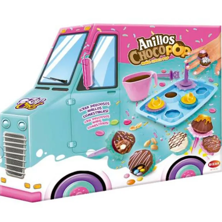 Con el anillos Choco Pop podrás diseñar anillos de chocolate que después se pueden comer ¡Escoge su decoración! Este playset incluye una jarrita, 6 moldes para anillos, 6 anillos, una base de plástico para trabajar y 4 palitos de chocolate. Es muy fácil de limpiar ¡Todo se puede meter en el lavavajillas! Recomendado a partir de 3 años.